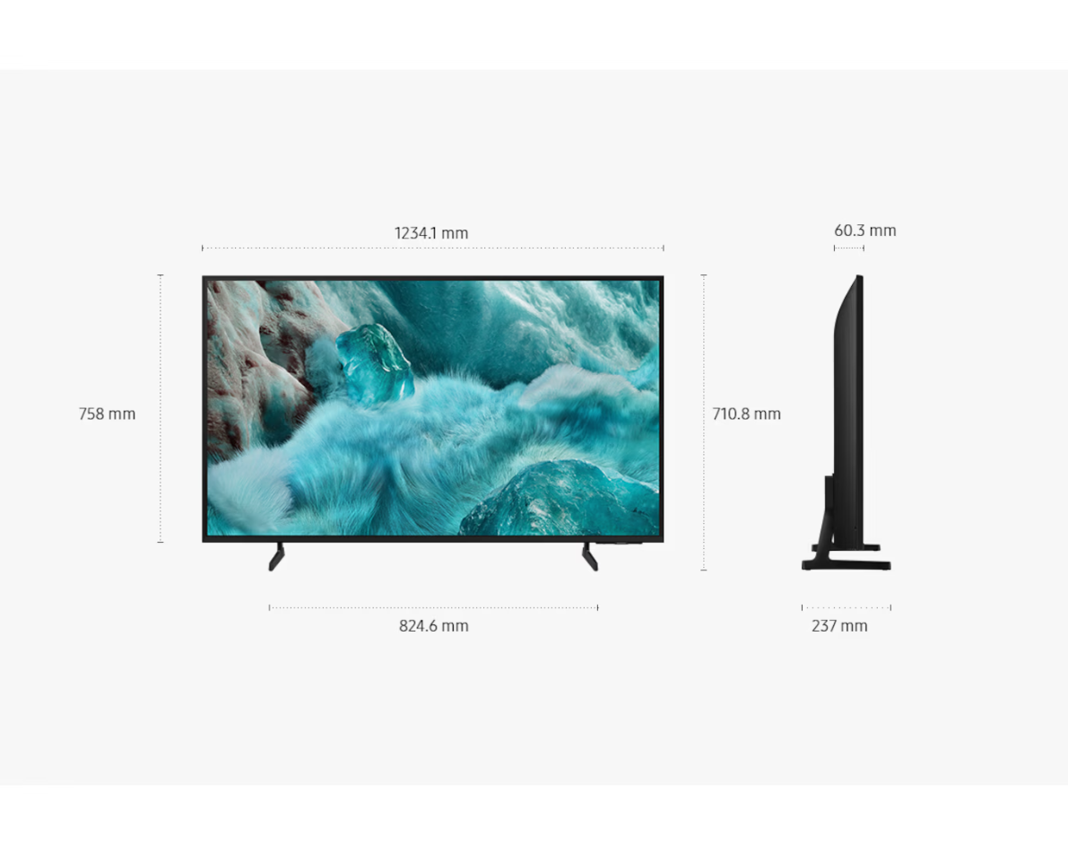 Diagrama de medidas frontales y laterales de un televisor Samsung de 55 pulgadas con soporte y sin soporte.