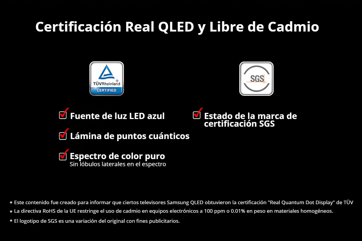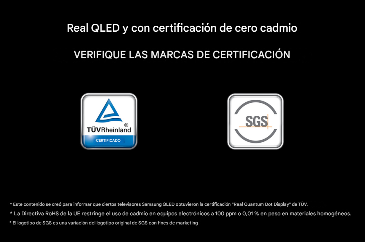 Certificaciones detalladas TÜV Rheinland para Pantalla Real Quantum Dot y SGS Sin Cadmio para Samsung QLED QN65Q7FAAPCZE.